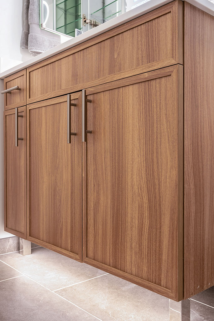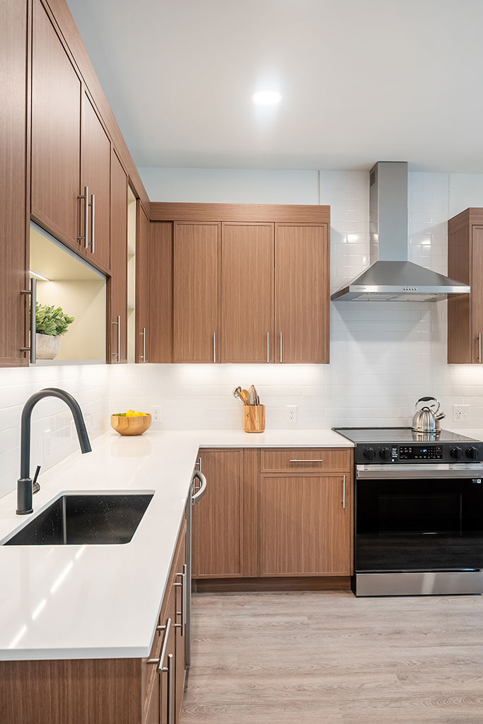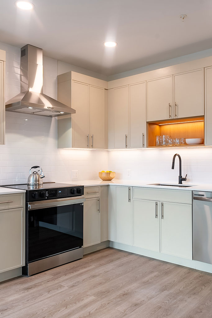 Functional innovation. We design, produce, and deliver kitchen cabinets for multifamily projects that follow the latest design trends and incorporate modern-day conveniences. Our kitchens feature pre-installed under-cabinet lighting and in-shelf lighting. Same with our bathroom vanities, that can include pre-installed night lights; both save on installation and electrical costs.